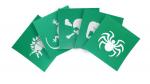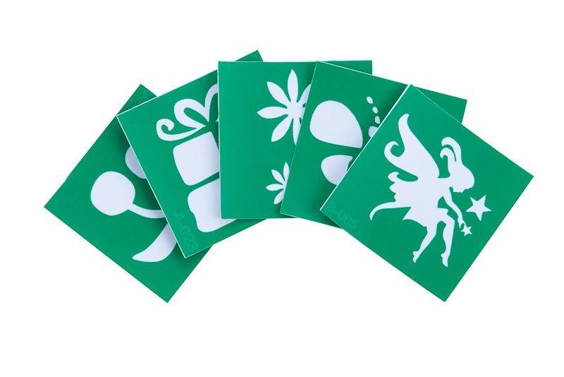 * Assorted pack of five play makeup stencils in girl or boy theme.